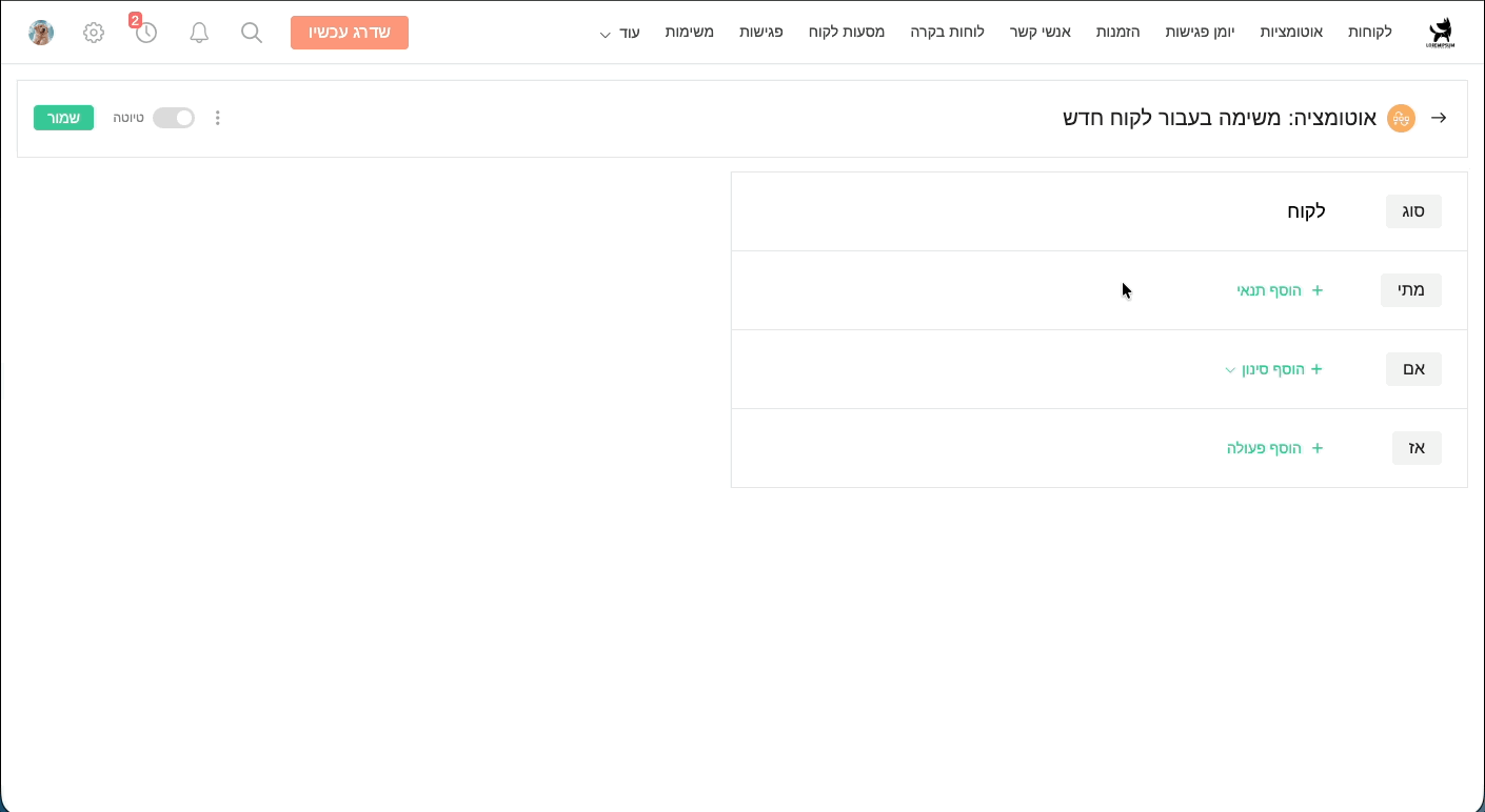 מטרתה של אוטומציה זו היא ליצור משימה אשר תתזכר את הנציג המטפל בלקוח כאשר הרשומה שלו נוצרת במערכת, לכן ניצור את האוטומציה בצורה הבאה: