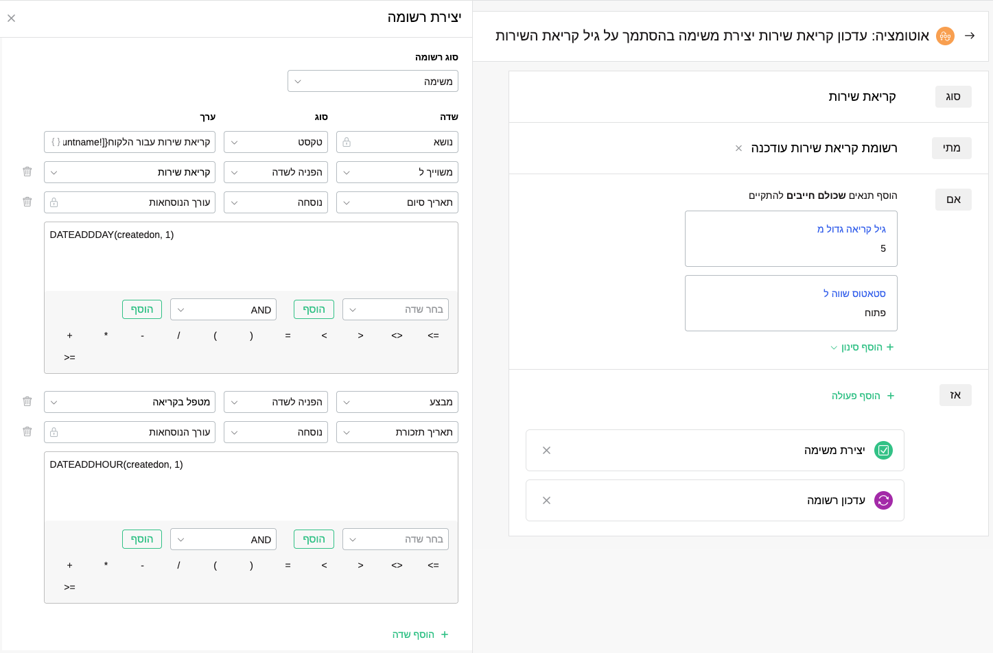 יצירת אוטומציה היוצרת משימה ומעדכנת רשומת קריאת שירות