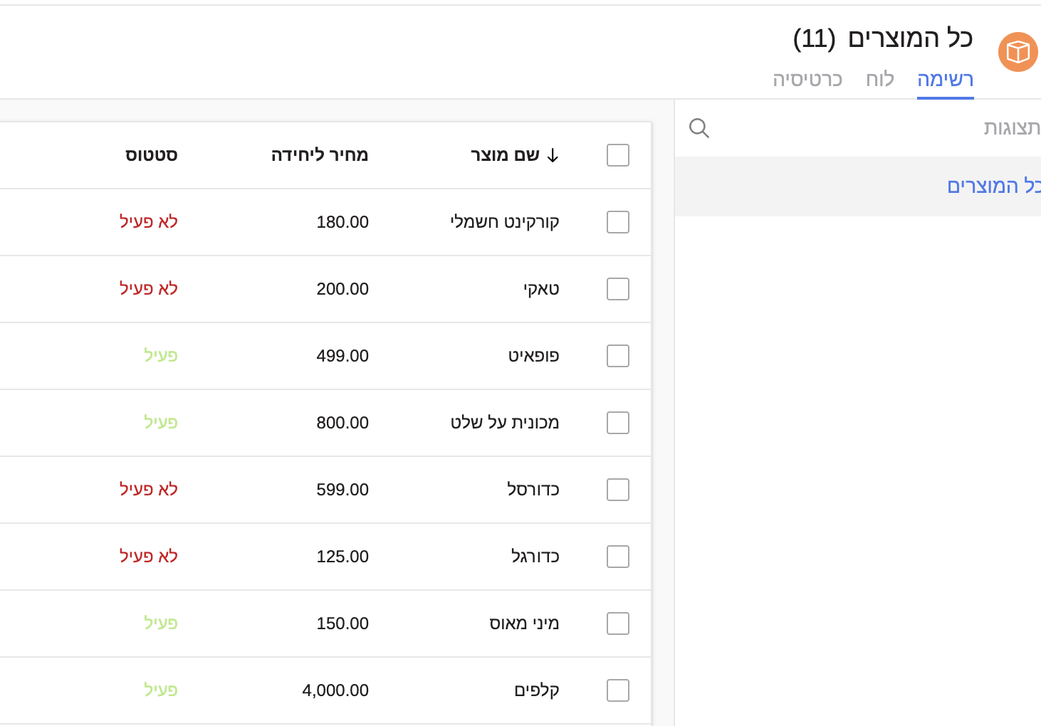 מוצר פעיל: מוצר המסומן כפעיל יופיע ברשימת הבחירה בעת יצירת הזמנות, הצעות מחיר או חשבוניות.