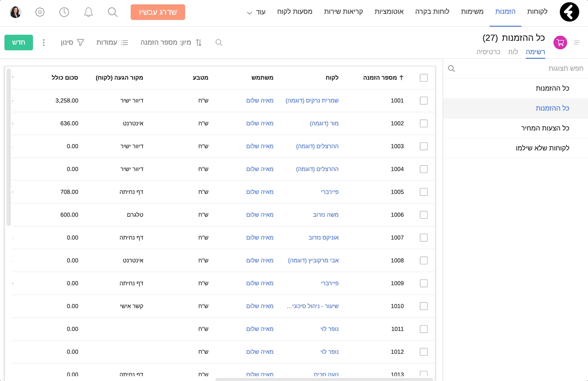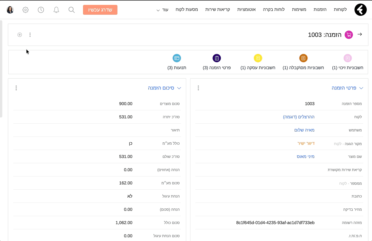 לאחר שהגדרתם את המוצרים שלכם, תוכלו לשייך אותם בקלות לכל עסקה או הזמנה דרך אובייקט "פרטי הזמנה".