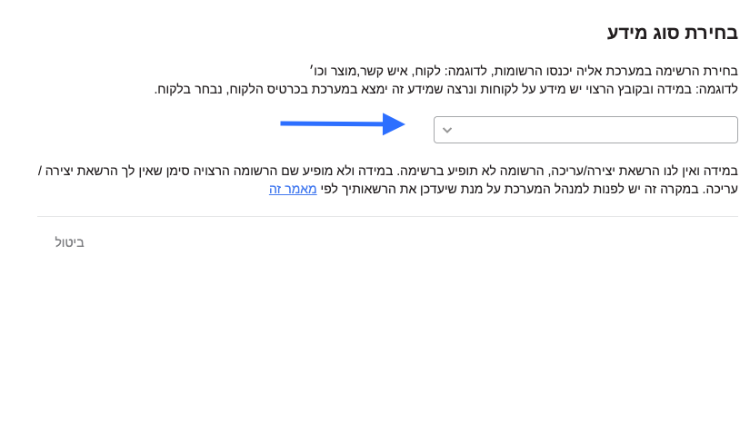 סוג המידע יכול להיות לקוחות, מוצרים, אנשי קשר וכדומה. למעשה תוכלו לאתר פה כל אחד מהאובייקטים הקיימים לכם במערכת. לסיום לחצו על הבא.