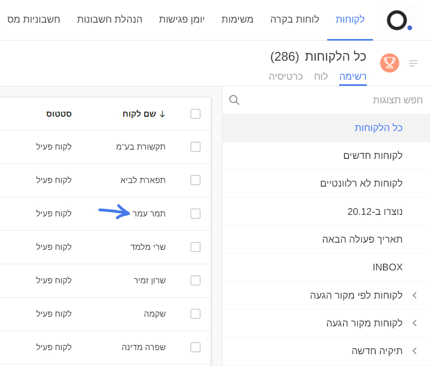 1. דרך אובייקט לקוחות בתפריט העליון > בחירת לקוח קיים.