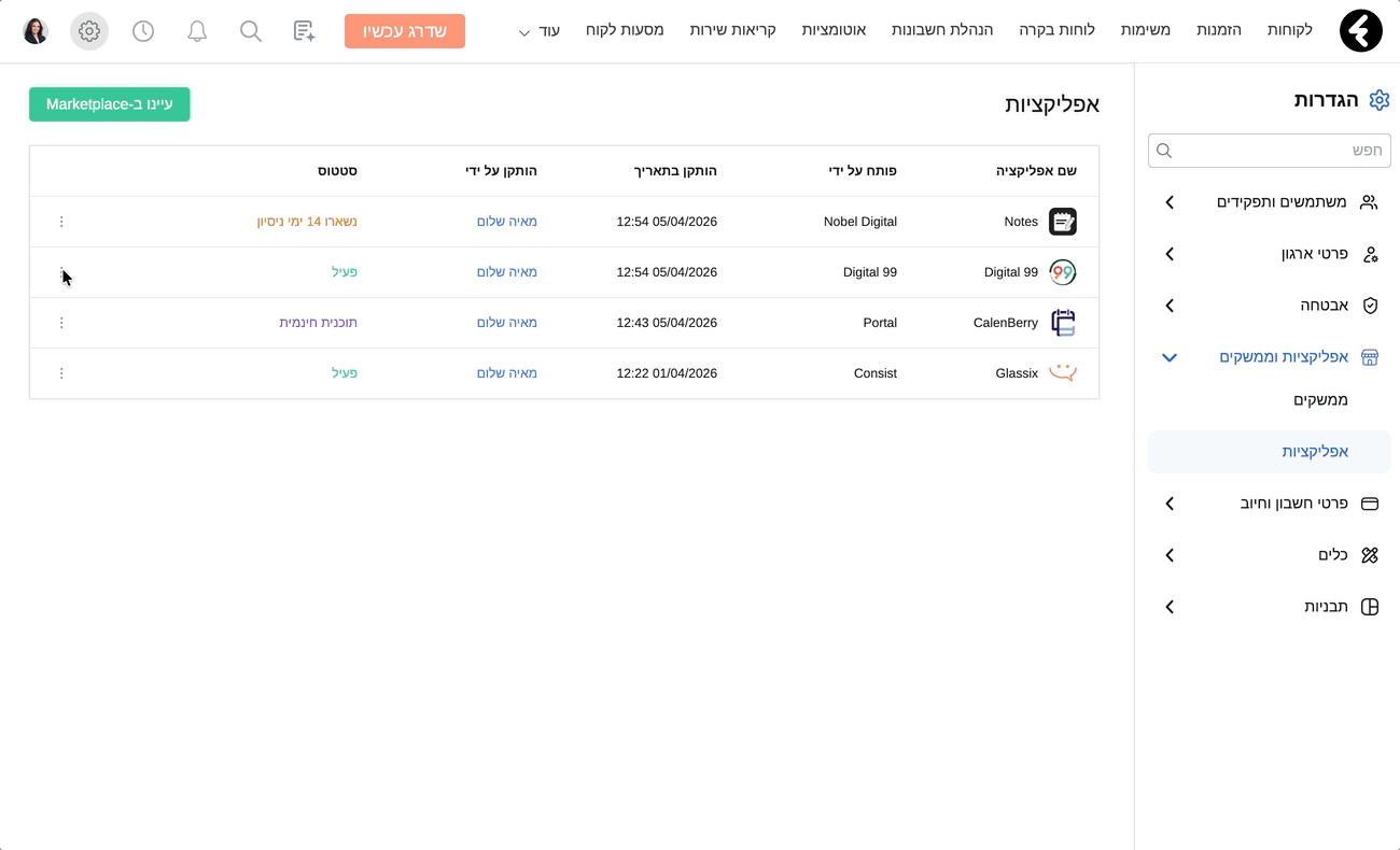 כדי לצפות בכל האפליקציות המותקנות בחשבון שלכם, נווטו אל הגדרות > אפליקציות וממשקים > אפליקציות. כאן תמצאו טבלה המרכזת את כל האפליקציות ואת הסטטוס הנוכחי שלהן: