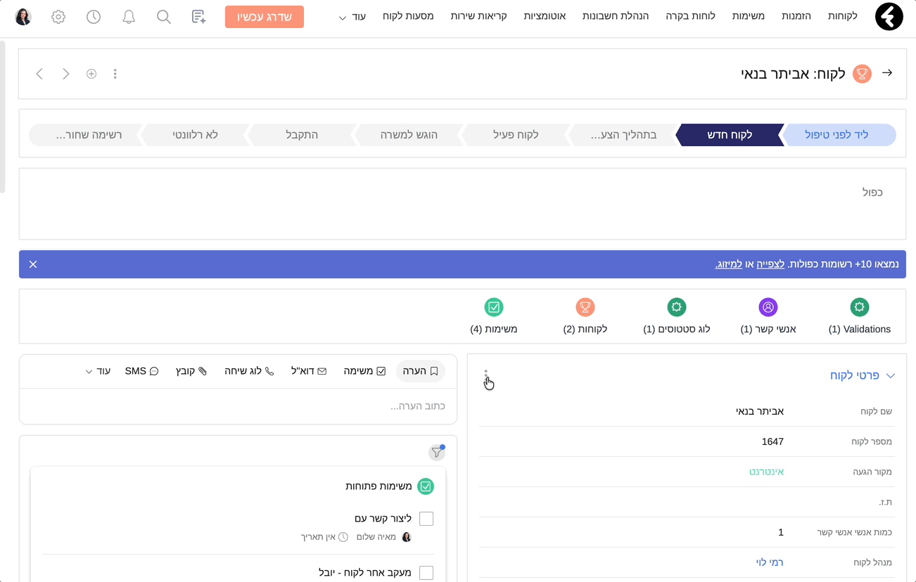 רכיב רשומה: מופיע בתוך עמוד הרשומה (למשל, בתוך רשומת לקוח).