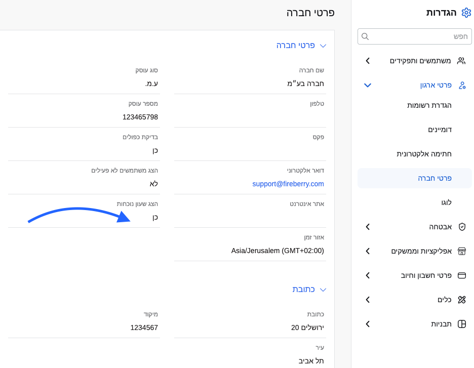 היכנסו לעמוד הגדרות על ידי לחיצה על אייקון גלגל השיניים בראש המסך משמאל > בתפריט בצד ימין בחרו "פרטי ארגון" > פרטי חברה > סמנו "כן" ב"הצג שעון נוכחות":