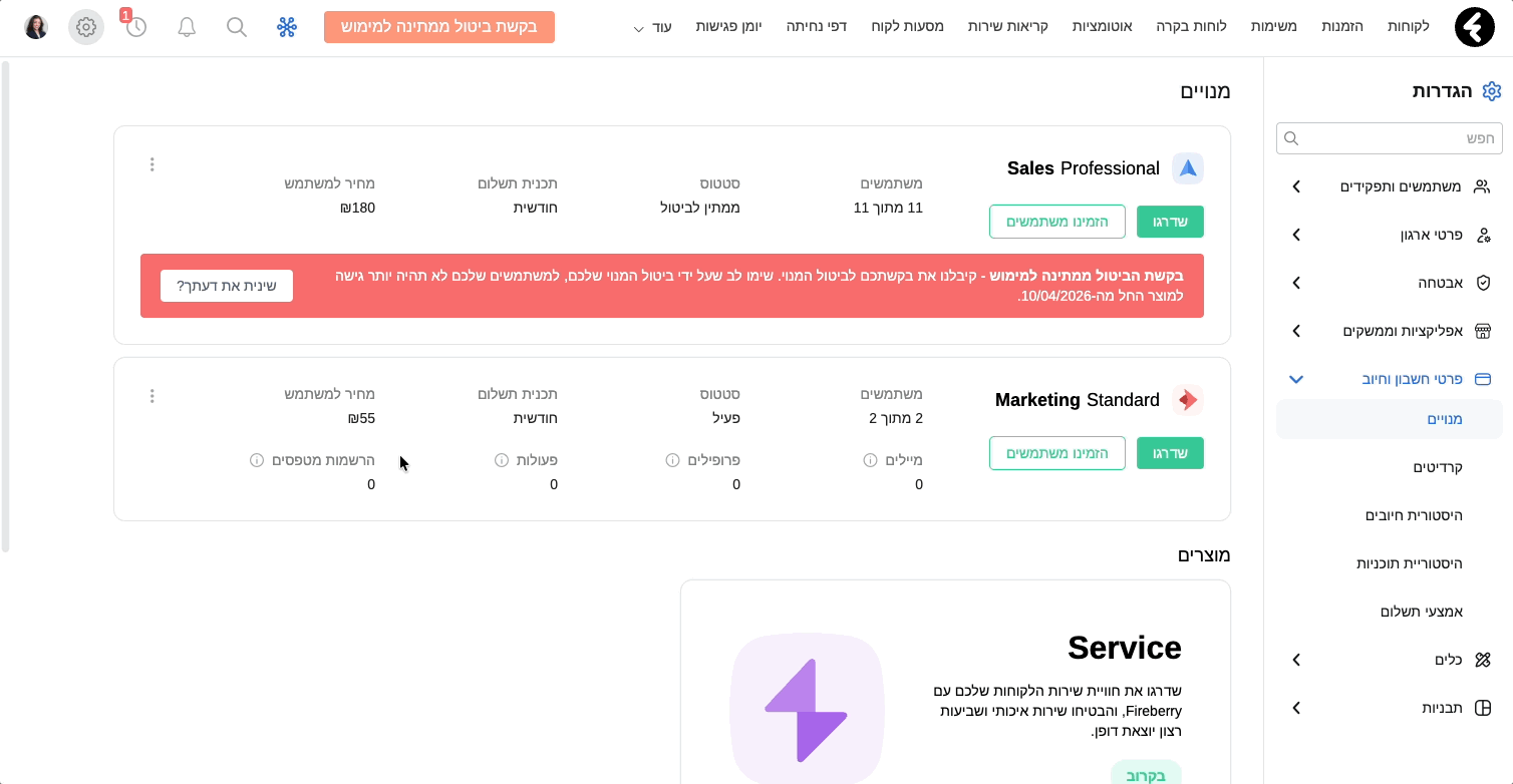 במידה ושיניתם את דעתכם ותרצו לבטל את בקשת הביטול, עליכם לחזור ללשונית מנויים שנמצאת תחת פרטי חשבון וחיוב בהגדרות המערכת.